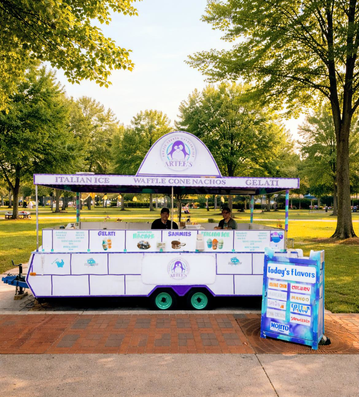 We can provide delicious flavored Italian ice in a 4oz, 5.5 or 8oz. We also offer gelati’s which are Italian ice layered with vanilla soft serve. To have the purchase go smoothly we would ask for a total head count in advance (48hrs prior to the day and time of the event/trip). You can pick up to three flavors, each additional flavor adds $30. MINIMUM ORDER OF 100 kiddie. Catering fee is $250 for 2 servers for 3 hours.